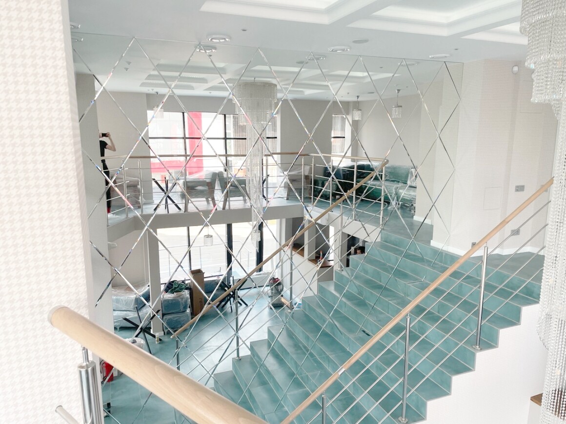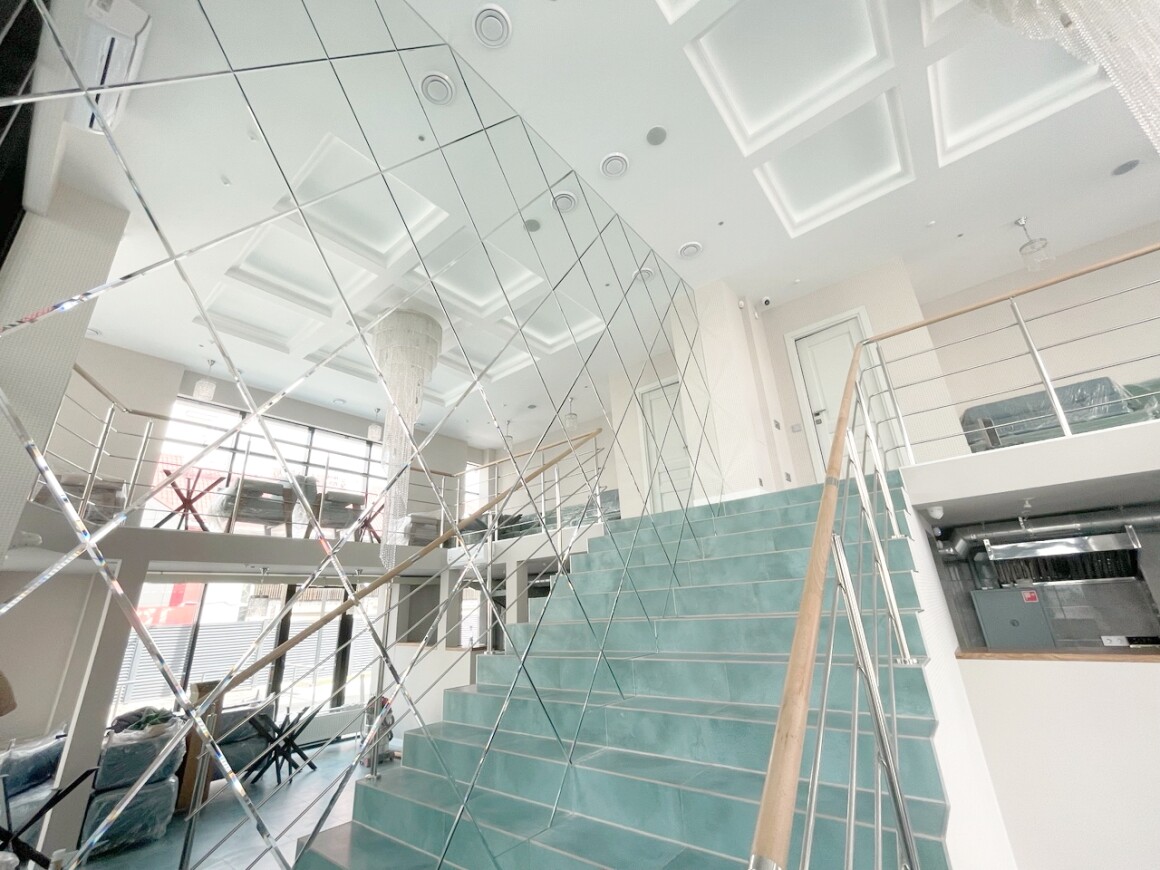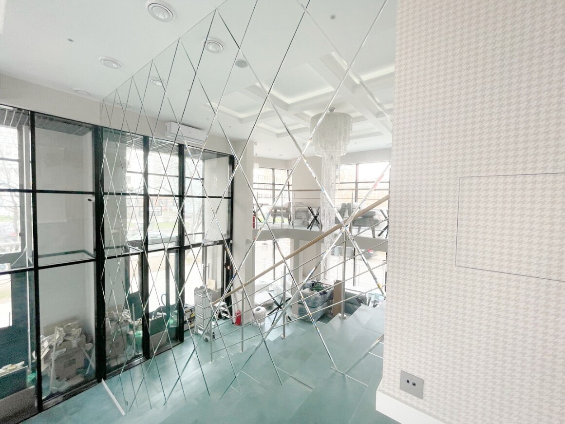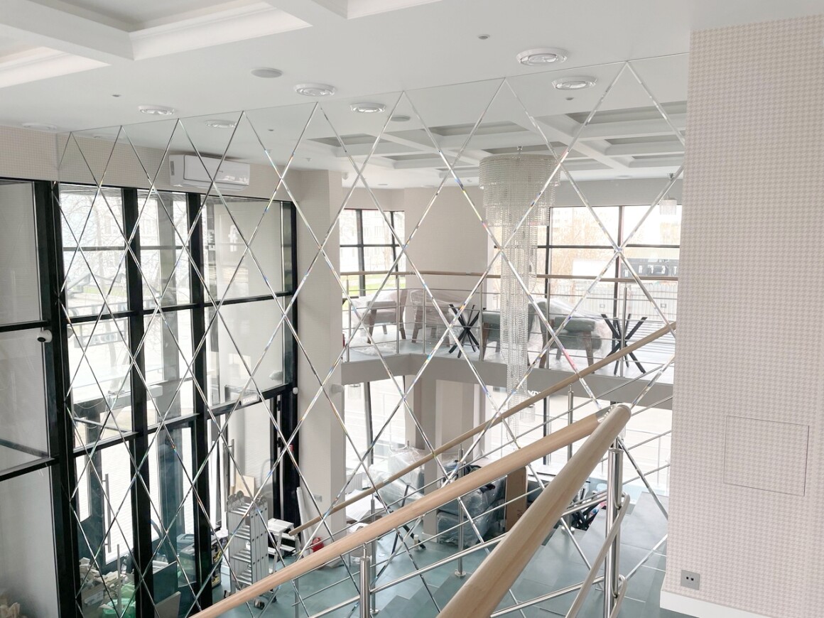 Нашей компанией было изготовлено панно из зеркал в форме ромб с фацетом 10 мм. Все крайние элементы подгонялись по месту и зазоры по конструкции не превысили 2 мм. Общий размер получился больше 3 метров шириной и почти 6 метров высотой.