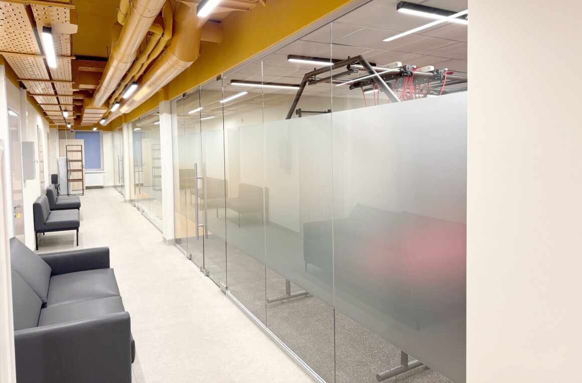 Выполнены работы по остеклению отделов 1 и 2 этажей. Общая длина перегородок больше 200 метров. На первом этаже высота стекла составляет 3 метра, а на втором более 3,5 метров.